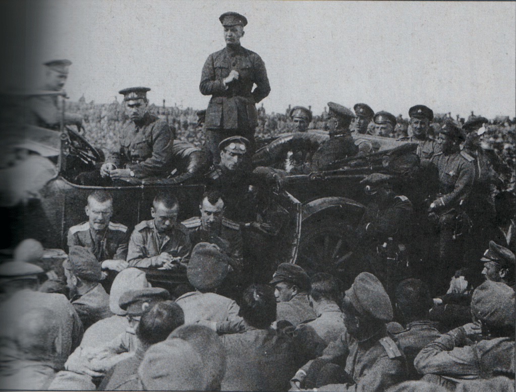Ele costumava frequentar os fronts mais problemáticos e fazia calorosos discursos por patriotismo, mas também por revolução. Algumas vezes era acompanhado por conservadores, outra por bolcheviques. Sua capacidade de oratória inflamatória (e eficaz) rendeu o apelido de Convencedor-em-Chefe, pois era chamado para apaziguar os ânimos na linha de frente e manter os soldados minimamente disciplinados e motivados para as batalhas.