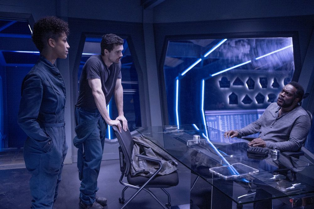 Todo mundo tá amargo, chato, desiludido… os líderes da Terra discutindo sobre destruir uma lua marciana é patético de várias formas. A primeira é a acanhada e mal explicada sala de guerra; mal sabemos o que os protagonistas são, de fato, no governo, que dirá os poucos extras. Depois, que não dá a entender que houve uma retaliação a altura, parece que foi desproporcional. Aliás, toda essa crise inicial foi muito mal administrada pelo roteiro, e, como ao longo da temporada ela praticamente é esquecida, esse mal estar continua. E, por fim, a naturalidade que todo mundo ali encara a situação, uma atrocidade tal como a que foi cometida, sendo destacada por uma suposta inteligência e saída rápida da situação.