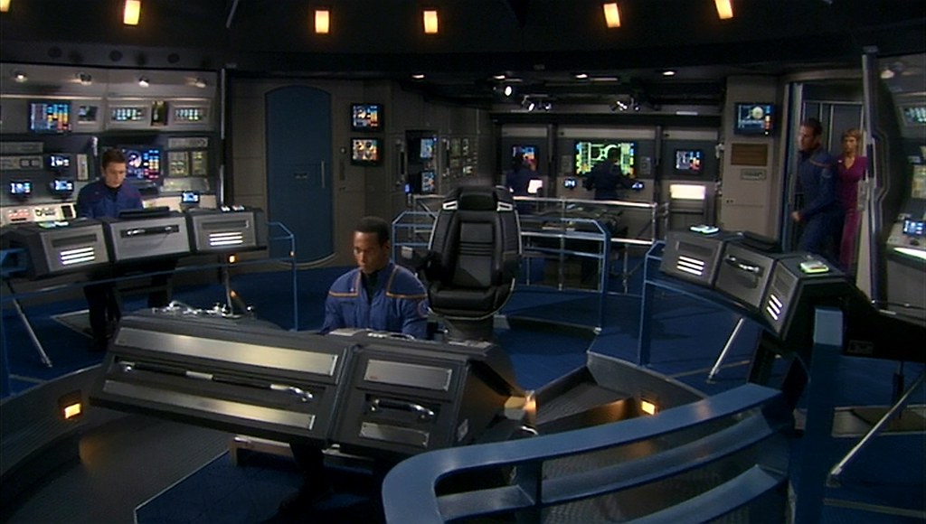 Entretanto, ela parece também muito mais próxima do século XXI; dentro da projeção otimista de Jornada nas Estrelas, parecem cenários e personagens próximos de existir. Os materiais e rotinas da nave, suas telas, e espaços parecem muito possíveis de existir daqui há 100 anos e também primitivos em relação às demais séries que se passam 200 anos a frente. O detalhe da viga cortando o gabinete de Archer no meio, obrigando ele a se abaixar o tempo todo, é genial.