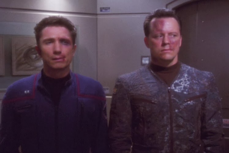 Aliás, aquele episódio, Percursor, escancara completamente o quão mal tudo foi desenvolvido. A relação entre os MACOs e a tripulação, que deveria discutir a militarização da missão da Enterprise e todo o dilema ético envolvido – que marginalmente são tocados ao longo do ano – não usa nenhum desses temas, vai para o caminho da comédia e o resultado é terrível. Por um lado, temos um triângulo amoroso entre T’Pol, Trip e uma personagem que jamais aparecerá novamente, por outro, dois oficiais passam o capítulo todo brigando (nas vias de fato) para ver quem é o humano mais macho do espaço sideral.