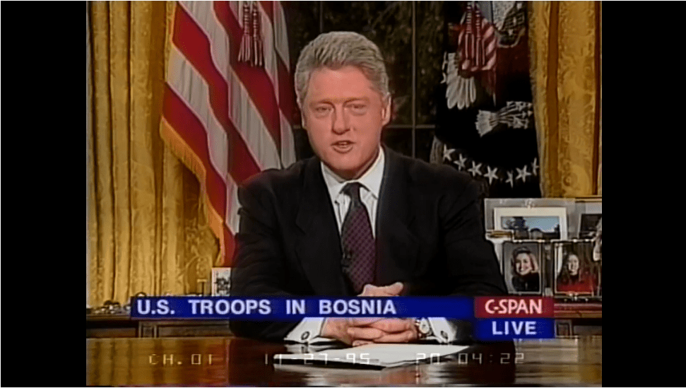 Há apenas, segundo ele, uma única exceção: o alinhamento dos EUA com a Bósnia, que lideraram o bombardeio aéreo da OTAN contra posições sérvias. Condição que autor explica como uma questão interna americana: devido a cobertura inicial da mídia, que divulgava massacres contra a população bosna, a “opinião pública” (que é encarado como algo quase que sobrenatural) pedia para o governo americano se alinhar com o “bem” naquele tão cruel conflito (sim, é essa palavra que ele usa).