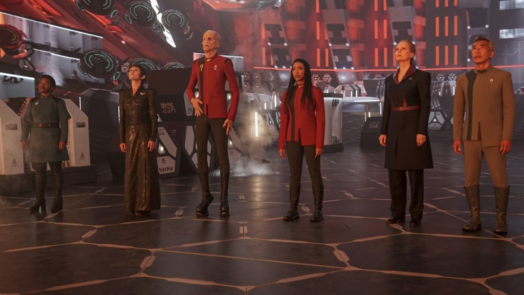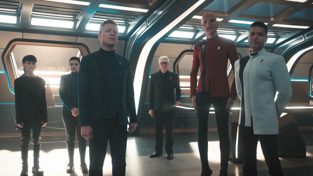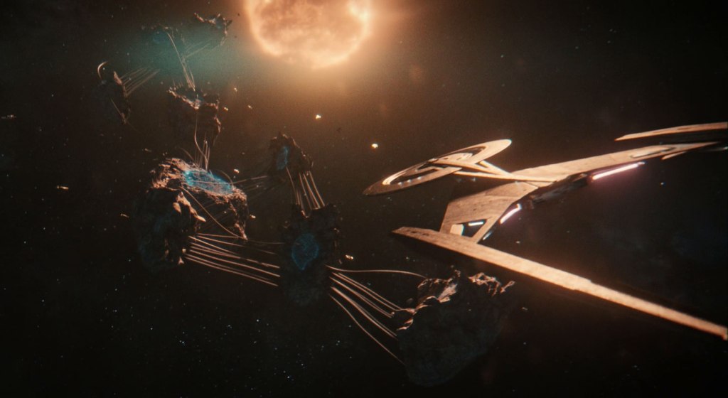 Infelizmente, o núcleo na nave de Tarka, apesar de caminhar para frente, é muito previsível. Você já sabe o que vai acontecer a cada diálogo – inclusive que algum outro personagem revelará uma tragédia do passado, como comentamos, Discovery virou um This is Us no Espaço. Acho que funcionou bem – a Reno, particularmente, é insuportável, com as tiradas repetitivas, mas deu certo para mexer na dinâmica – só não é nada demais.
