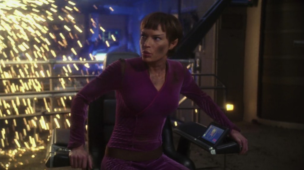 2 – S04E18 e E19: Um Reflexo Sombrio – Quando as incursões no Universo Espelho demoravam anos para se repetir, qualquer passada por lá era marcante. Especialmente depois que em DS9 a situação se inverteu e os humanos passaram a ser vítimas, foi muito legal voltar ao período do terrível Império Terrano em seu auge. Integralmente se passando naquele mundo paralelo, foi na medida certa e ainda nos brindou com muitos elementos e visuais da TOS. Foi uma carta de amor a qualquer Trekie.