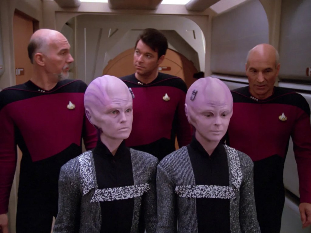 S01E14: 11001001 – Em uma rara vez que vimos a Enterprise D estacionar numa base estelar, a nave passará por mais uma atualização, realizada pelos impassíveis Binários: uma espécie parecida com robôs e que atuam sempre em grupo. A tripulação é dispensada e o comandante Riker decide passar um tempo no holodeck, onde se apaixona pela misteriosa Minuet.