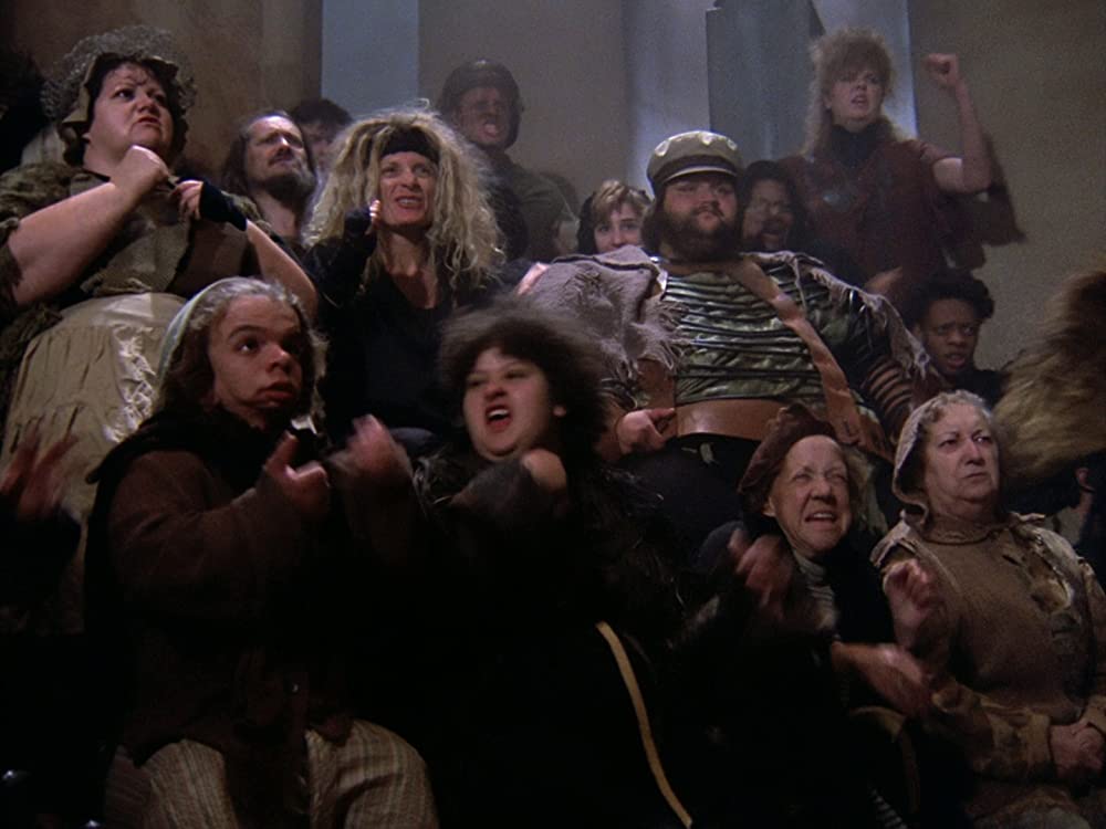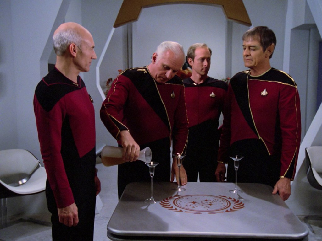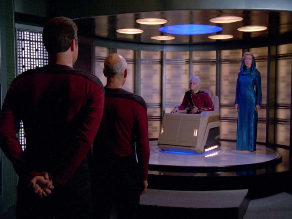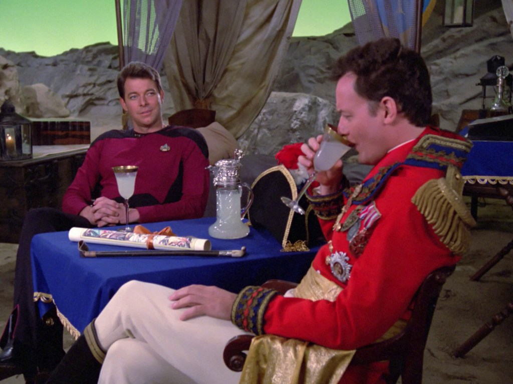 Essa opção por parodiar a França me dá a impressão que nessa primeira metade o alvo esperado para o objetivo de Q ainda era Picard (ele ironizava o idioma francês em Encontro em Longínqua). Em algum ponto, sem muita razão, o antagonista divino lança tudo para o alto e transforma a brincadeira numa situação para testar Riker.