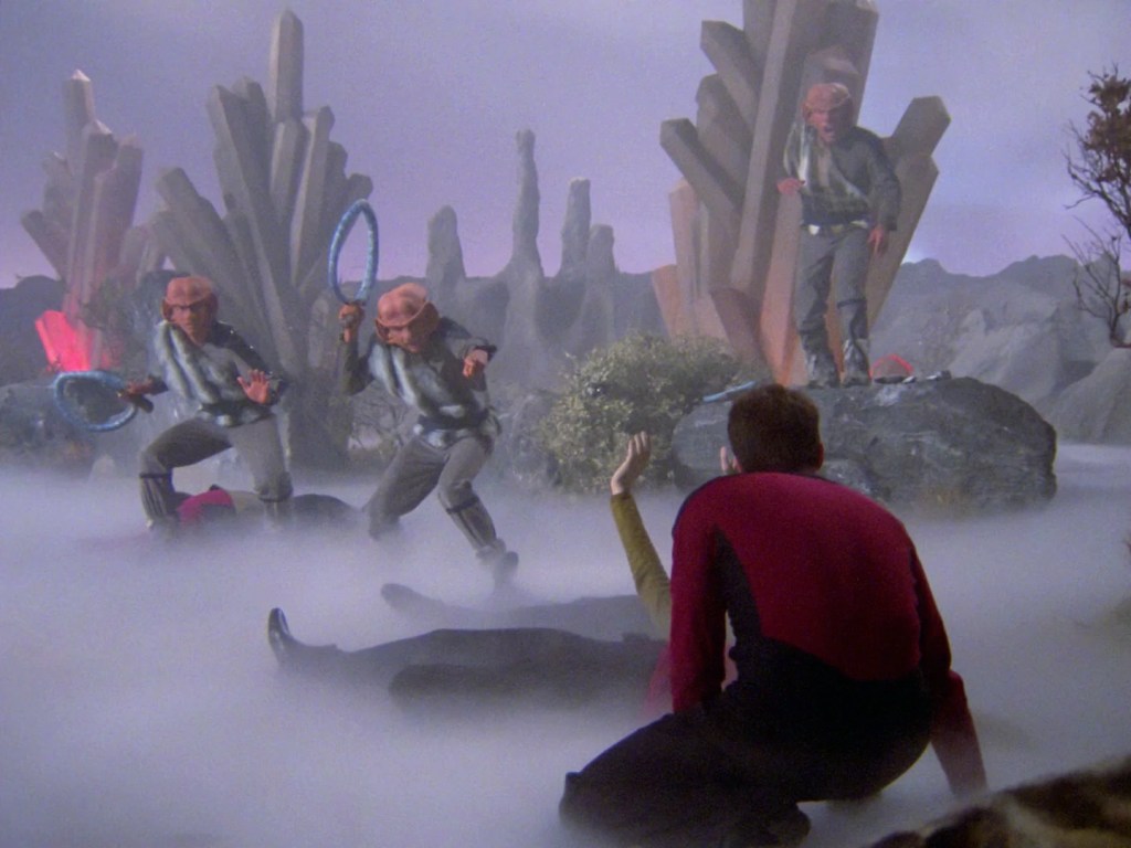Novamente, em enredo, não é tão estranho – inclusive, no “universo expandido” essa trama é consertada com uma relação entre os trills e a caracterização desses insetos como simbiontes. Tanto que a escolha pelos aliens “comedores de cérebros”, na realidade, foi uma opção para preservar o caráter utópico da Federação – só mesmo numa situação extrema como essa ela seria corrompida. Não que seja uma grande história, os diálogos e as cenas são bem fracos para algo que se propõe tão sorrateiro e conspiratório, mas o que estragou definitivamente foram as opções visuais.