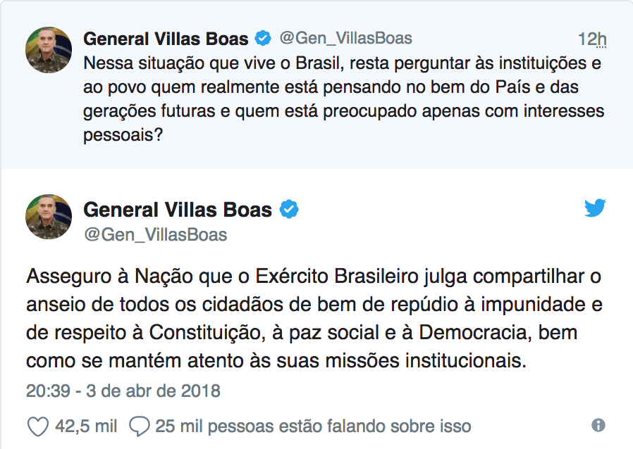 Talvez o momento mais importante desse período, e que recebe um capítulo totalmente dedicado a ele, é o infame tweet do general Villas-Boas. No qual o comandante do exército ameaça o STF diante da possibilidade da corte conceder habeas corpus ao Presidente Lula no início de 2018, e, consequentemente, viabilizar sua candidatura à presidência. A maior parte da corte contemporizou essa manifestação, ainda que dentro das Forças Armadas a reação foi grande pela postura assumida do oficial mais poderoso do país. Depois de algum vai-e-vem, o general explicou, em 2019, que era uma mensagem para apaziguar ânimos de quem, na época, clamava por intervenção militar.