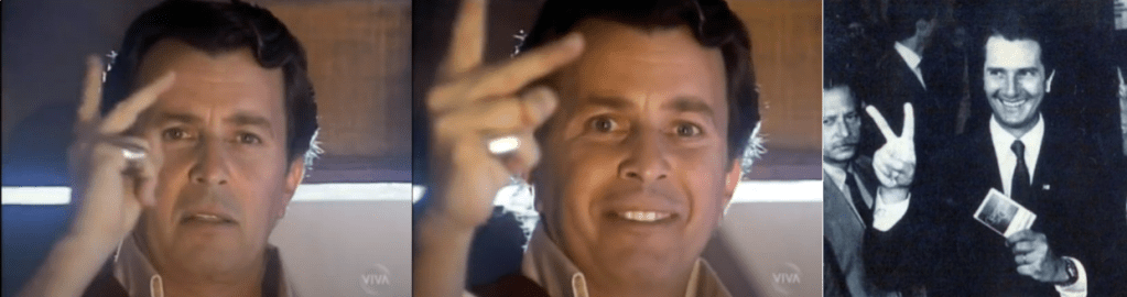 No último capítulo da novela, exibido em 15/09/89, exatamente dois meses antes do primeiro turno das eleições, e interpretado pelo mais poderoso diretor da Globo, Daniel Filho, o nobre discursa para uma multidão armada e levando tochas no reino. Ele ressalta a importância das eleições, e pede para a população “ter cuidado com os maus políticos” e para ter “olho no voto”. Ao mencionar a palavra “voto”, por duas vezes, ele fazia um inexplicável gesto com “V”, invertido, com os dedos, conforme a imagem acima. O mesmo gesto era empreendido pela campanha de Collor, ao fazer alusão aos dois “L” de seu sobrenome.